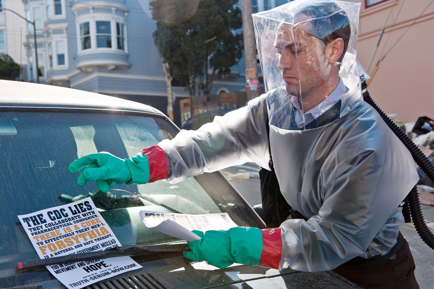 The key to the film, he says, is a scene in which Laurence Fishburne’s CDC official, Dr. Ellis Cheever, appears on CNN to debate the character of Alan Krumwiede (Jude Law), a conspiracy theorist who rises to fame by stoking anti-government sentiment as the pandemic spreads. At one point, Krumwiede fakes contracting MEV-1 so that he can “cure” himself on his popular video blog with a simple homeopathic remedy derived from forsythia. The public responds by overwhelming pharmacies in search of it, causing the virus to spread as infected individuals come into contact with healthy people.