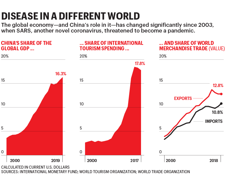 Businesses, meanwhile, are taking measures that are just as drastic. Some of the world’s leading airlines have announced they won’t be flying to China, home to more than 1.3 billion people and the globe’s second-largest economy, until at least April. Thousands of Chinese factories, dormant during Lunar New Year celebrations, have yet to reopen. Where does this extraordinary series of events leave us? In a sign that this may be the sort of black-swan event the business and investing worlds worry over, experts say they simply don’t know. Epidemiologists and economists alike have struggled to put numbers or context around what they’re looking at. Early efforts to benchmark this outbreak and its likely impacts against the 2003 SARS (severe acute respiratory syndrome) outbreak—also caused by a coronavirus—have been largely abandoned, given China’s larger role in the world economy, and COVID-19’s far more rapid spread.
