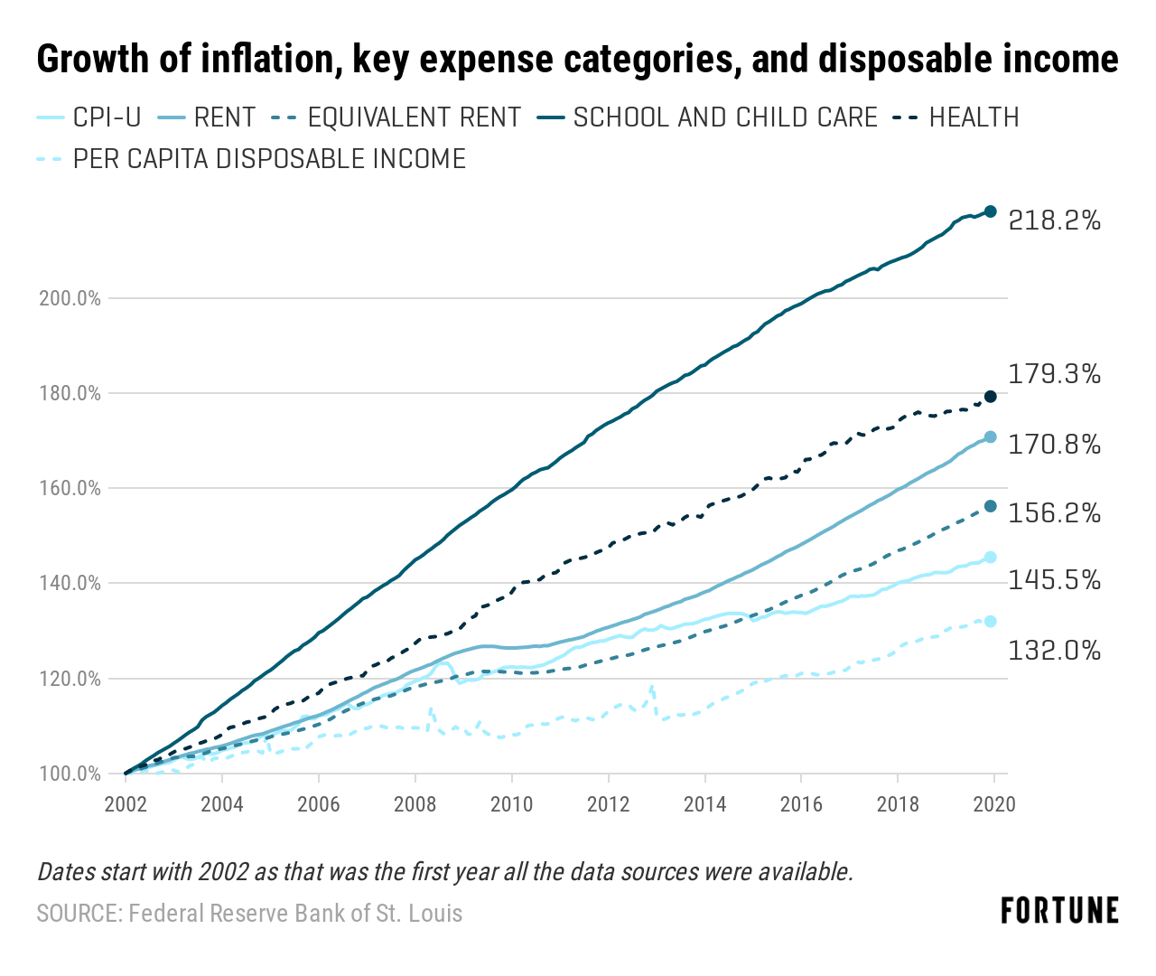 To dig deeper, you have to look at how inflation is calculated. And what the government measures, versus what the average person paying for housing, healthcare, school and childcare (categories that have grown anywhere from 18% to 65% faster than disposable income) experiences, are two very different things.