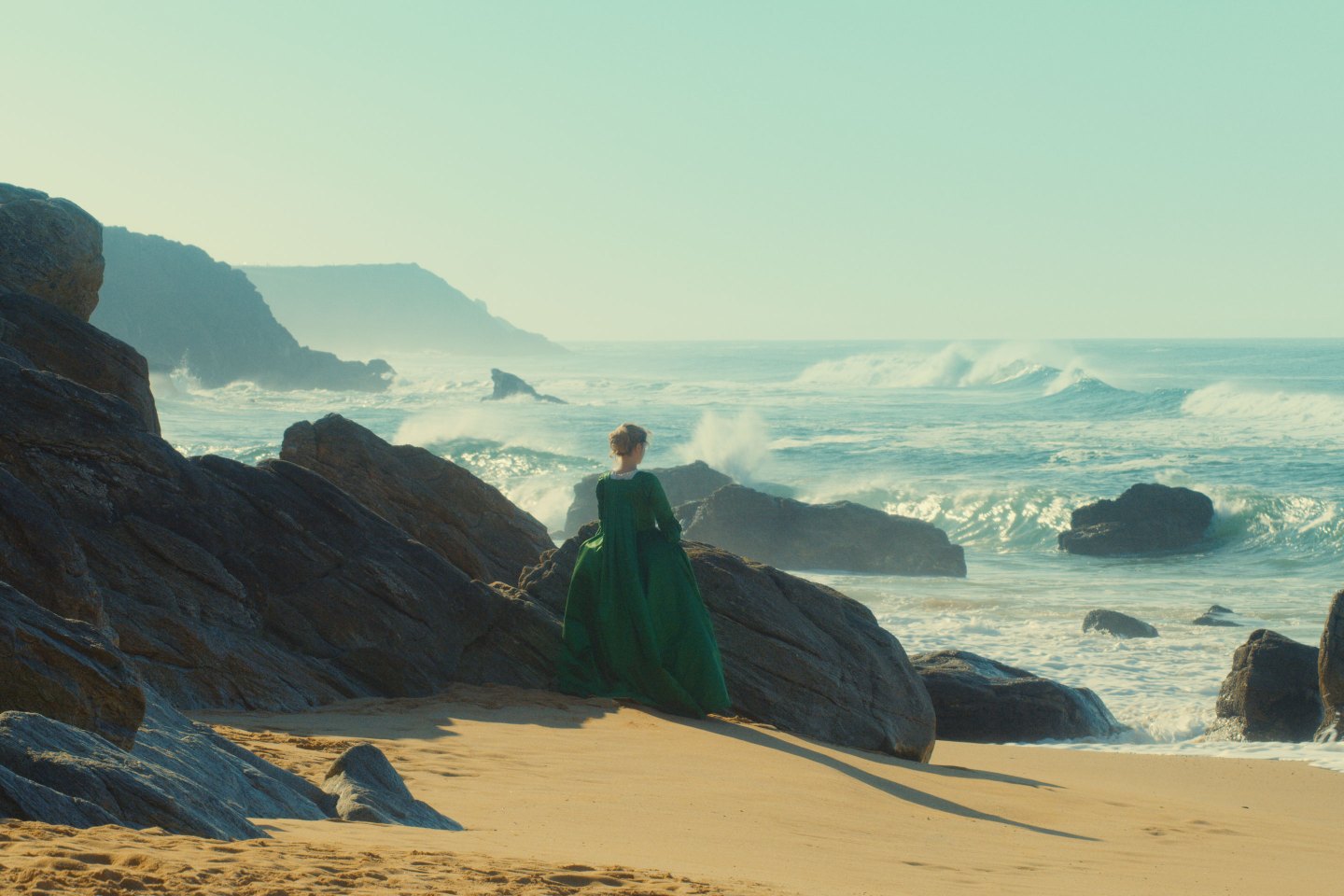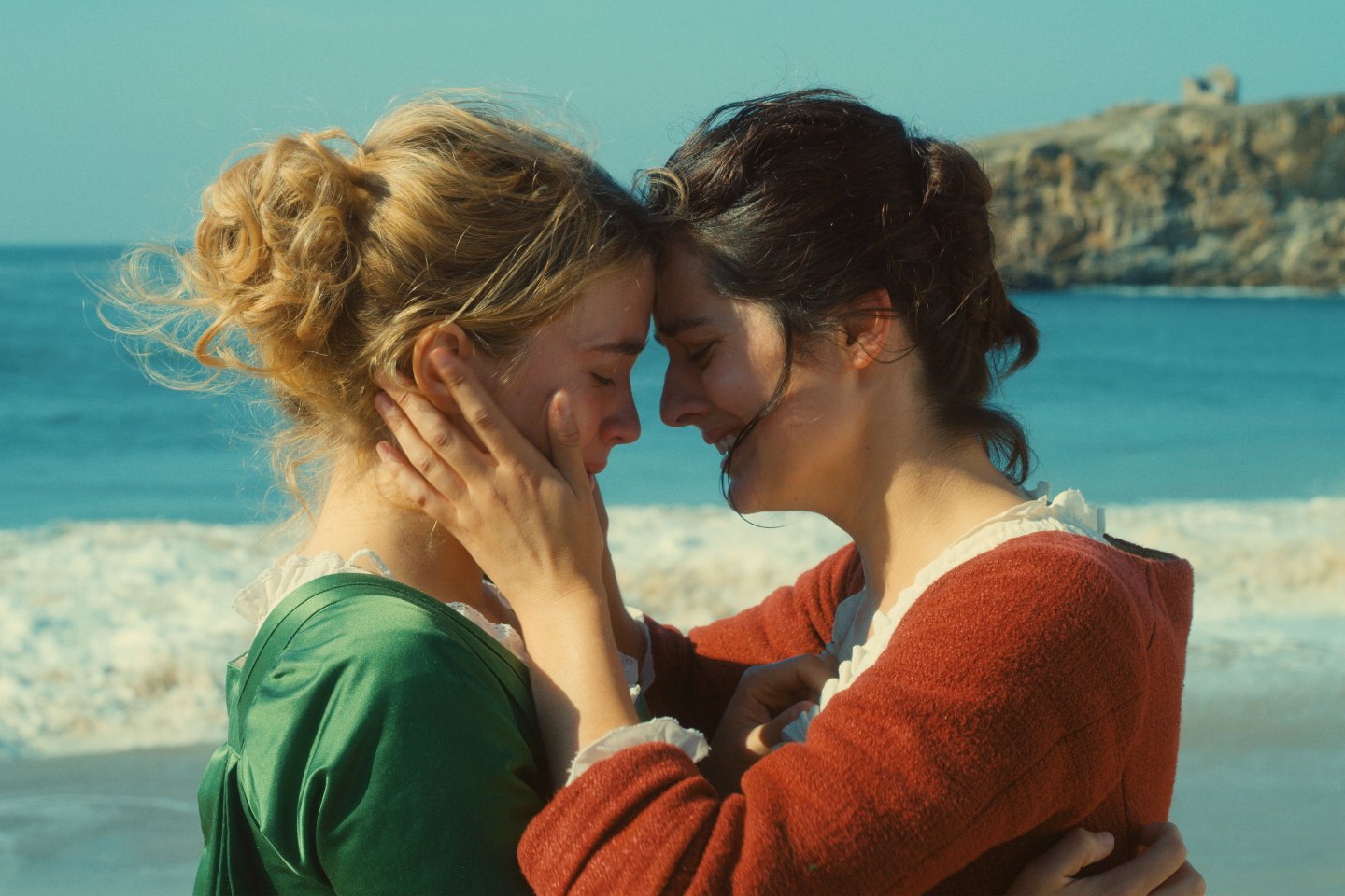 Two women stand on a cliff’s edge, their flowing gowns buffeted by the wind, their expressions lost to sea. One steals a surreptitious glance at the other; moments later, just as discreetly, it’s returned. Then, a sudden charge shifting the air between them, both look again and meet one another’s gaze, submitting to the unexpected power of at once seeing and being seen.