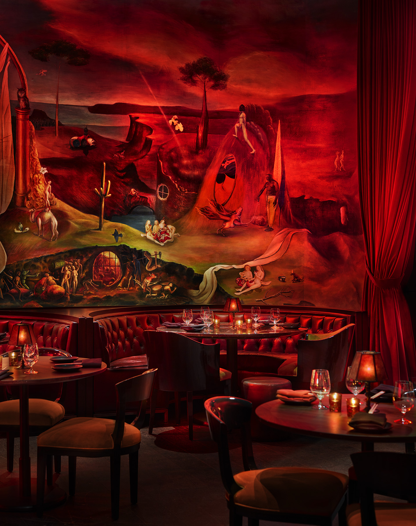 Those customers reach out to the duo to create large-scale paintings that will adorn the walls of various spaces. “They generally have a mood or a vibe or a certain theme that they are trying to stick within, so we usually start there,” Noah says. After coming up with a narrative that will inspire the project, the team—which, in addition to Noah and Castaño, includes seven expert assistant painters—work on sketches, eventually moving to physical samples and full-scale mock-ups.
