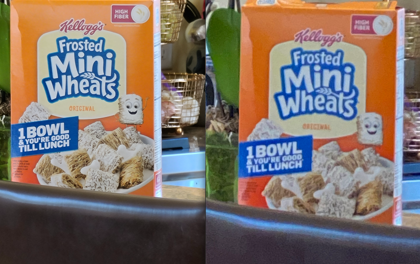 The Ultra, however, has a 10-times optical zoom that works incredibly well. The pictures the phone takes at 10-times magnification are clear and detailed, as you can see in this shot of a Mini Wheats cereal box. On the left is a cropped picture from the Ultra. On the right is a similar cropped shot from the iPhone 11 Pro taken from the same distance at 10-times magnification, which relies on software to zoom in. The difference is striking.