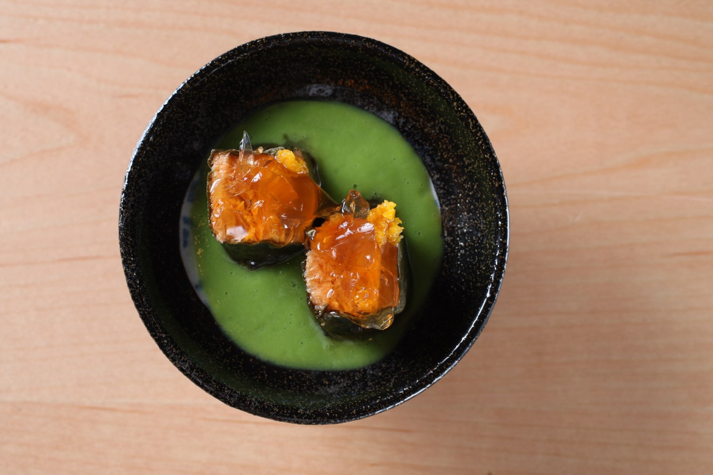 His take on the Hawaiian dish lau lau uses the cheek of the opah—typically a bycatch fish—and king salmon wrapped in luau leaf, topped with bonito-flavored rice vinegar gelée. He serves moi, known as the fish of Hawaiian royalty, after marinating it for three weeks in red rice vinegar. Steamed monkfish liver is served on a pillow of red-vinegar rice and matched with three-year pickled baby watermelon.