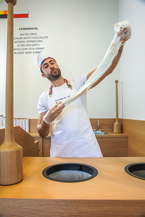 It starts with milk, cream, and sugar, which are then mixed with two ancient ingredients: sahlab, a ground orchid root predominantly found in Lebanon, and mastic, a resin released by the bark of a tree that grows exclusively on Chios, a Greek island. “We actually import [the mastic] directly from the Chios Mastiha Growers Association, a consortium of farmers that are certified,” says Michael Sadler, one of the four co-owners of Republic of Booza. The concoction is then put into a freezer drum but, instead of being churned out as ice cream, it is taken and alternately pounded with a three-foot-long wooden pestle and stretched by hand to achieve the elastic consistency for which the dessert is known.
