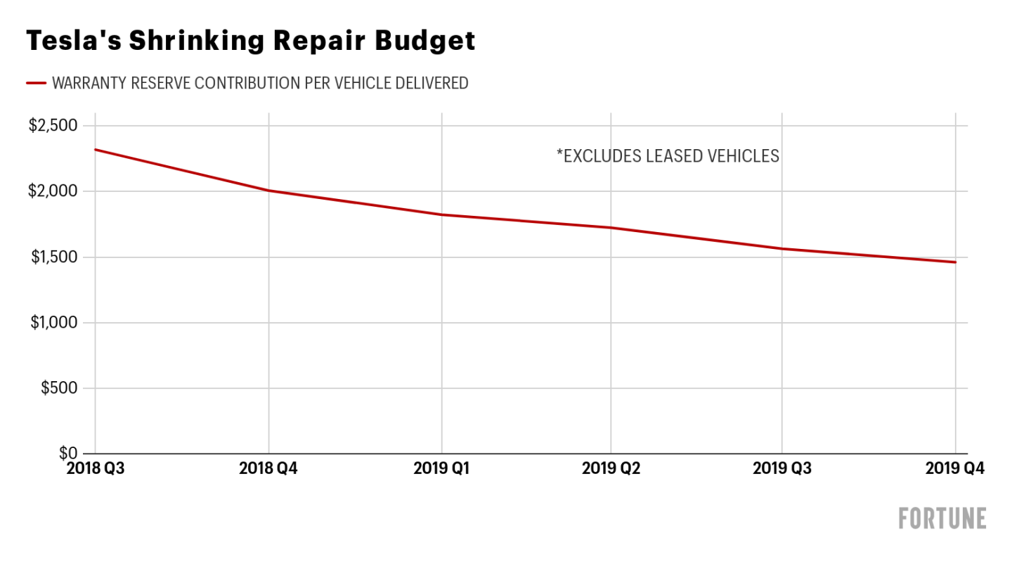 With those unknowns, Fortune’s calculations, after adjustment for leased cars, showed a clear trend. In the fourth quarter of 2018, Tesla budgeted an estimated $2,007 per car to pay for repairs for the duration of the cars’ warranties. By the fourth quarter of 2019, the allocation had declined almost 27%, to just $1,467 per car.