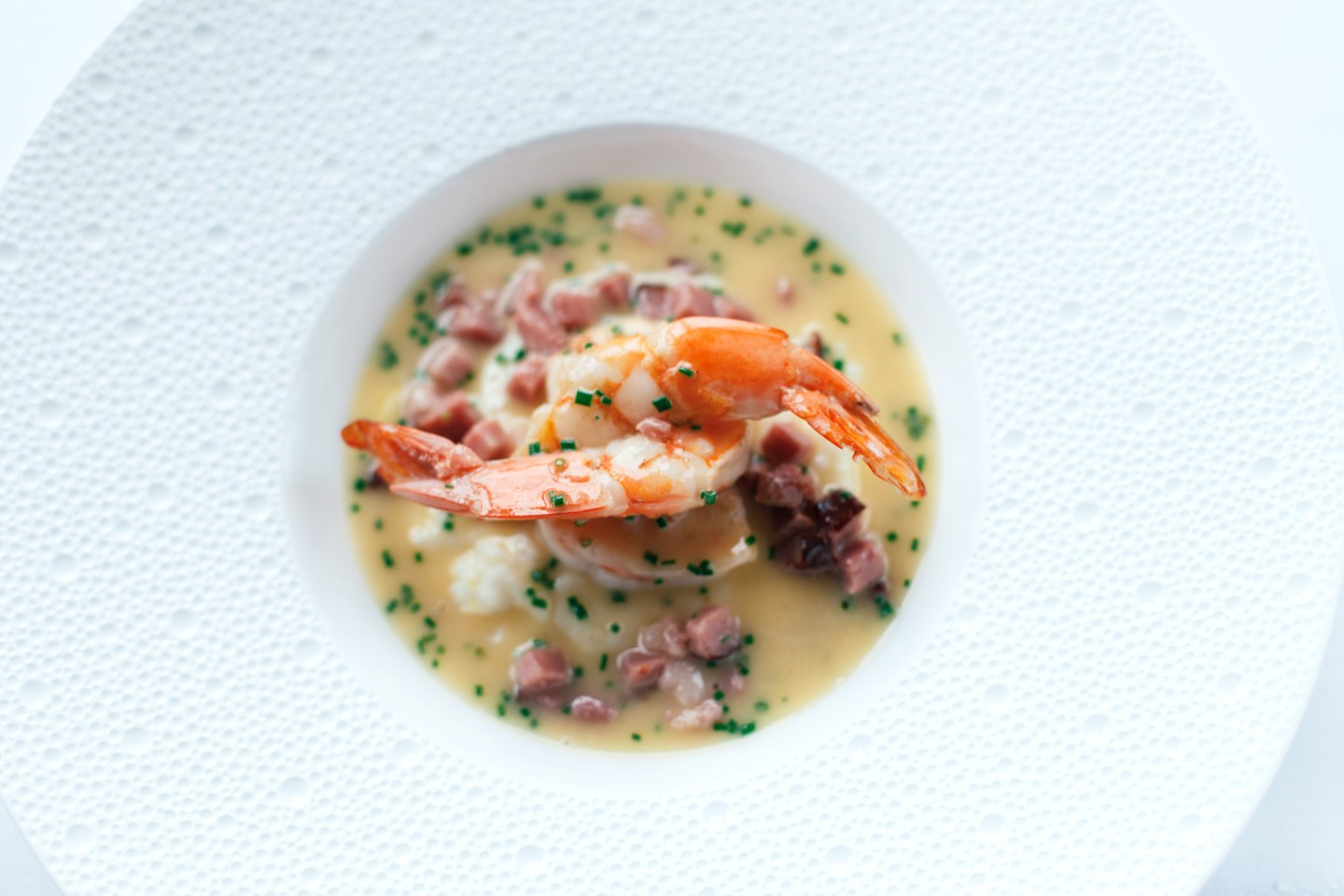 One upside to the foie was my favorite wine of the pairing: a natural Galician Grenache-Carignan blend as cool and inky as walking barefoot on the beach at midnight. My favorite dish of the tasting, meanwhile, was a classic Wolf has been perfecting for decades: shrimp and grits. Ringed in a luminous beurre blanc, succulent twin Gulf prawns locked heads over creamy, perfectly cooked Anson Mills grits. (Before he became the ambassador of Low Country corn and grains, Glenn Roberts was the manager at the old Silk’s in Charleston, S.C., the restaurant where Wolf did her culinary internship.) A meticulous brunoise of andouille sausage and tasso ham covered the shrimp, whispering smoke and spice into each bite with a Cajun accent.