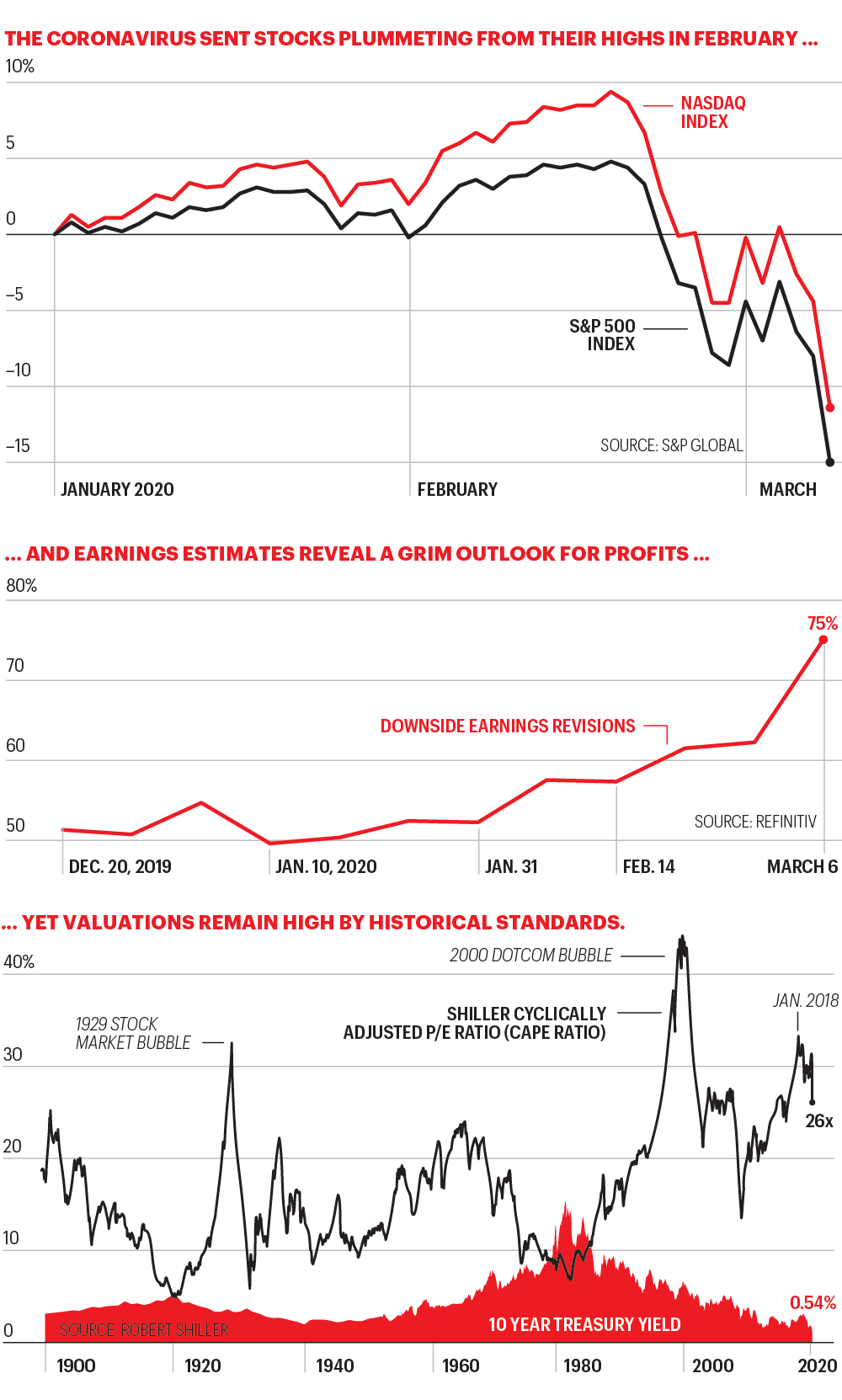 As the effects of the coronavirus continued to spread throughout late February and March, the stock market sustained a series of blows. Investors were not only plagued by uncertainty, they also began to reassess the rich premiums they had been paying for all sorts of assets. And once they started asking “How much is this market really worth?” the answer was bleak indeed. “In the past cycle, the elixir was that when the Fed eases, the price of risk assets goes up,” says Liz Ann Sonders, chief investment strategist at Charles Schwab. “That narrative is now undergoing an epic shift. Credit is tightening even though rates are falling, and that’s hitting valuations.”