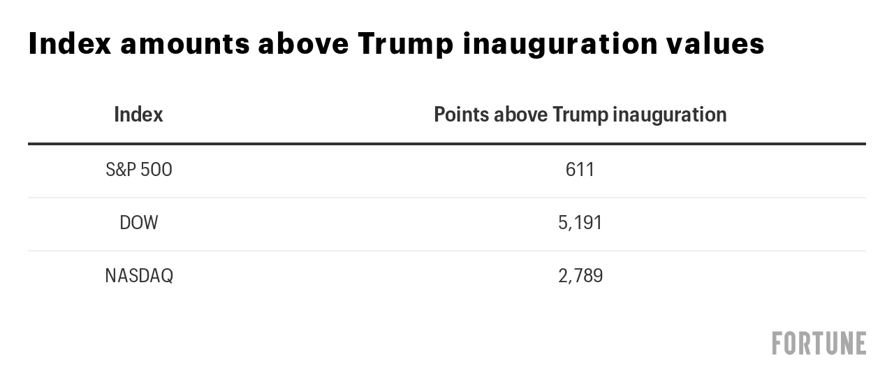 To understand how long in theory indexes might have to lose their Trump gains, Fortune analyzed the S&P 500, Dow, and Nasdaq, marked their 2020 highs, and calculated how much, on average, they lost per trading day—even accounting for the periodic big jumps that have been part of the roller coaster ride during the last few weeks—to reach their values on Tuesday’s close.