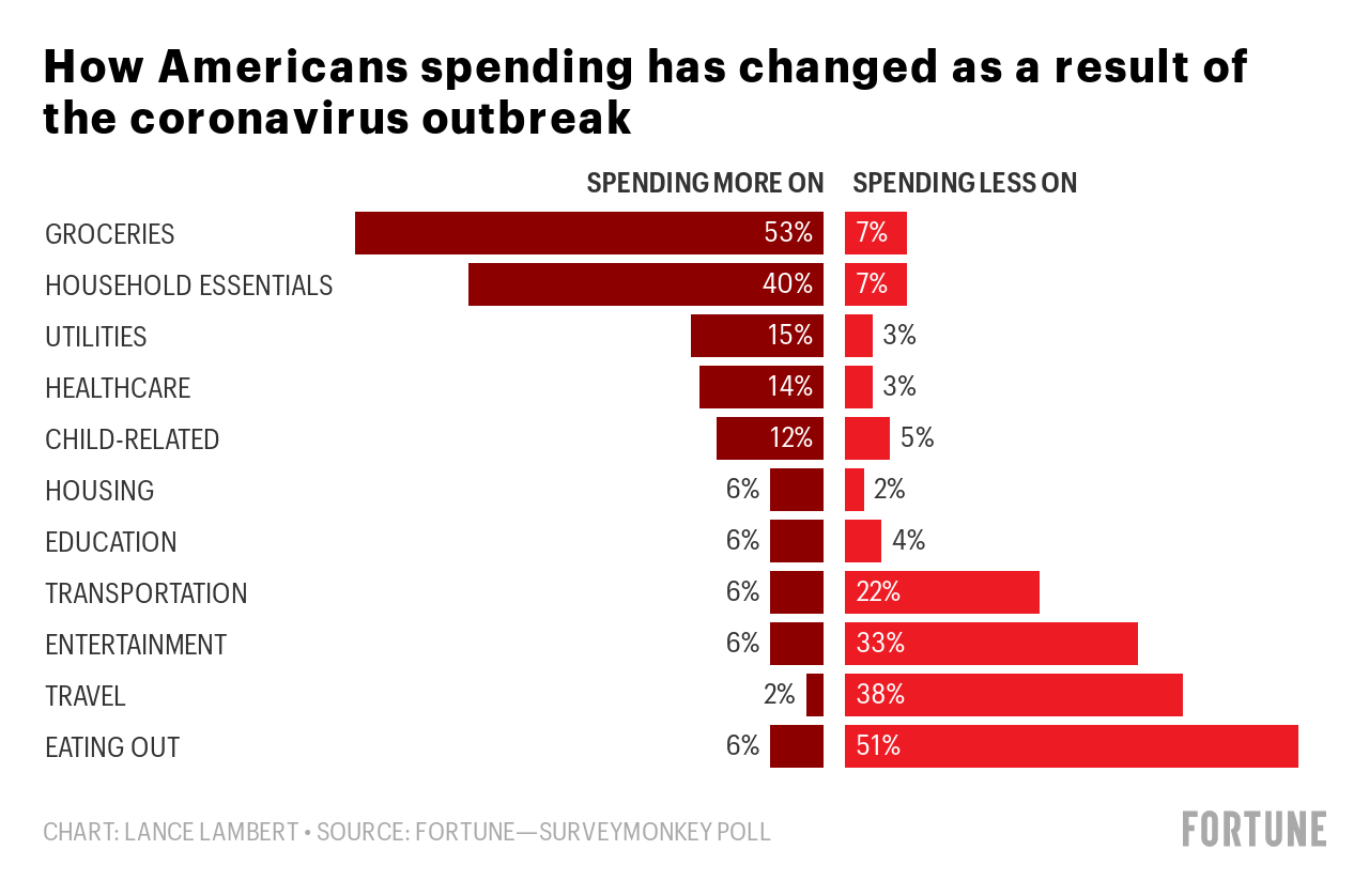 The shock caused by the coronavirus outbreak has Americans shifting how they’re spending their money. As panicked buyers rush to stock up, the Fortune-SurveyMonkey poll finds around half of Americans are spending more on groceries (53%) and household essentials (40%).