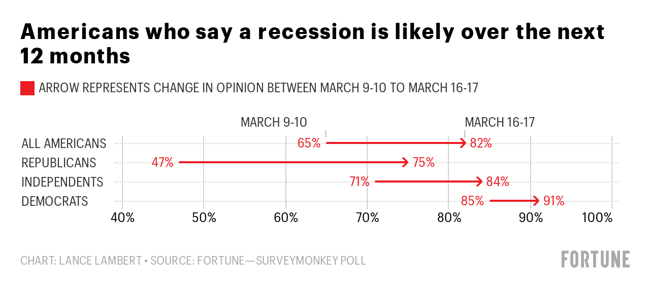 - … of Americans say a recession is likely in the next year, compared with 65% who shared that opinion last week. That number is 91% among Democrats and 75% among Republicans.