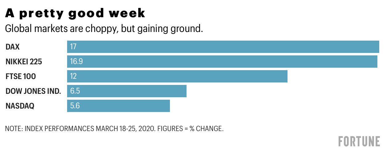 Investors have witnessed a rarity this week: a two-day rally in equities. The Tuesday-Wednesday gains marked the first time in the past six weeks we’d seen consecutive “up” days. It was touch and go for a while. “Despite a hectic last few minutes of trading on Wednesday prompted by Bernie Sanders threatening to stall the $2 trillion stimulus bill, indexes managed to stay in the green,” my colleague Anne Sraders detailed.