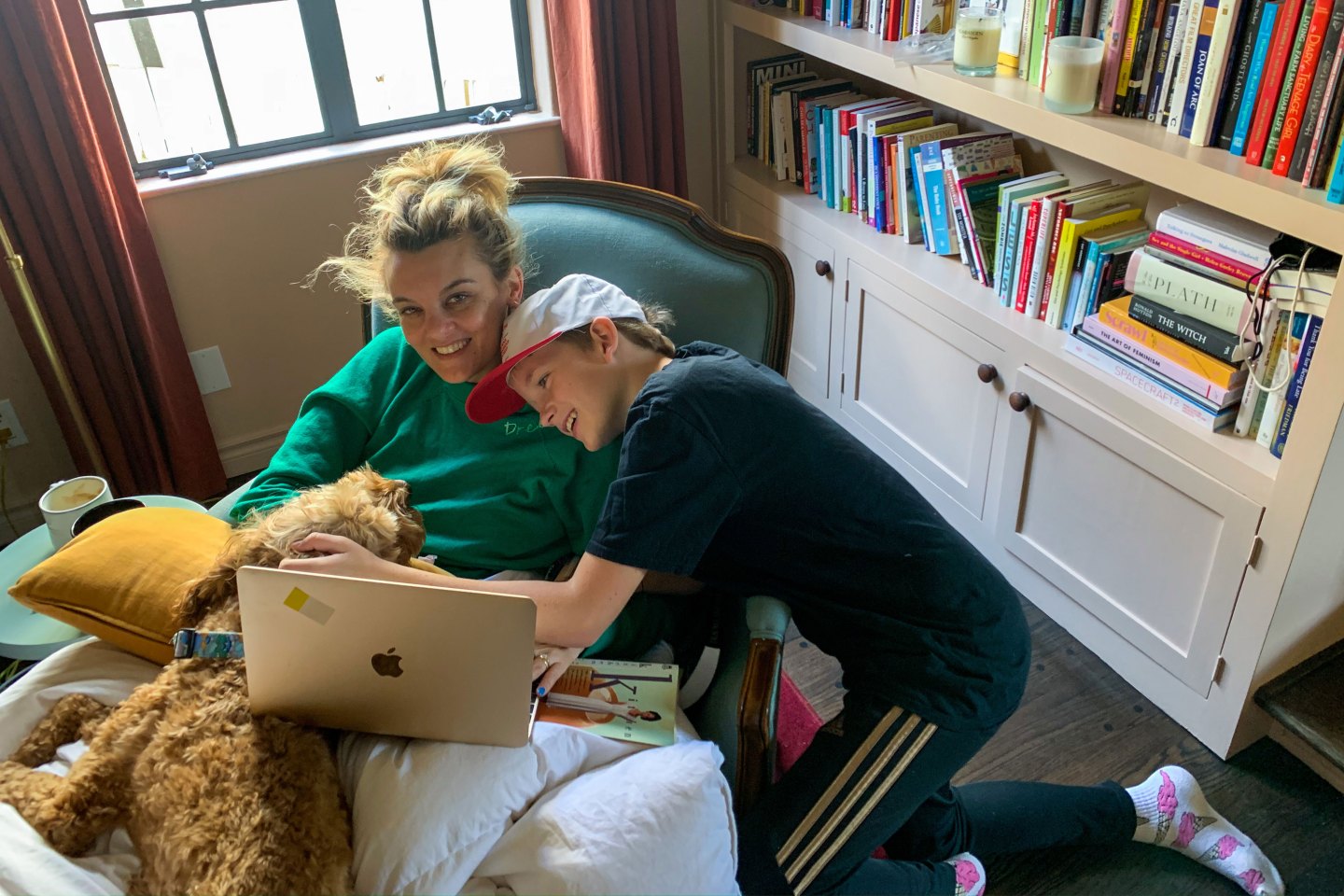 Garbus: “Up at 7:30 a.m., breakfast. At 8:30 the kids go to ‘school,’ and I run/walk with our new puppy. I start work around 9:30; break for lunch with kids midday. Late afternoon/early evening, we do online workout videos, play games and with the dog; then dinner and relax before bed.”