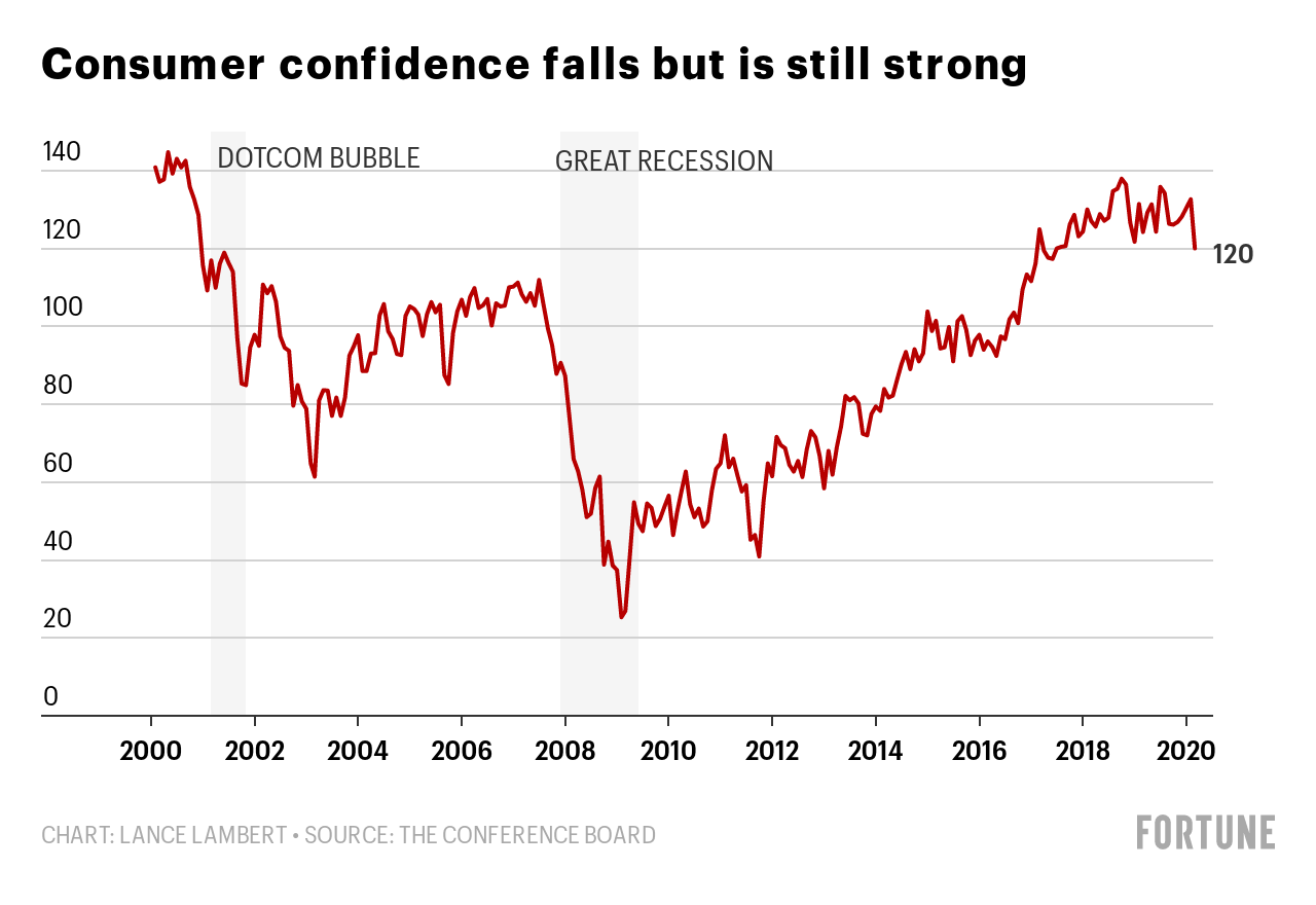 Consumer confidence dropped in March, according to the Conference Board’s Consumer Confidence Index. The index was at 120, down from 132.6 in February. While this drop moves consumer confidence back to 2017 levels, it is still far above where it was during the Great Recession.
