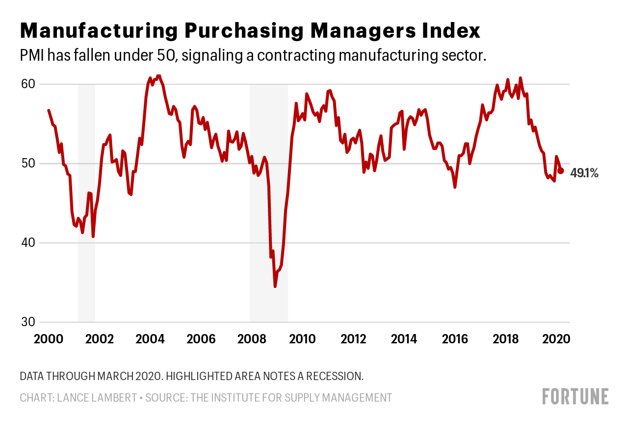Even before the coronavirus outbreaks, U.S. manufacturing was already lethargic, contracting several times late last year. The Institute for Supply Management’s Purchasing Managers Index (PMI) came in at 49.1% in March, down from 50.1% in February. A PMI below 50% signals a contracting manufacturing sector—something that has happened six times over the past year. But that mild dip isn’t as bad as many other industries. The reason is that states like Ohio and Pennsylvania have deemed manufacturers essential and allowed them to stay open. And some manufacturers with ties to the health care industry are as busy as ever, as they ramp up production of items like masks.