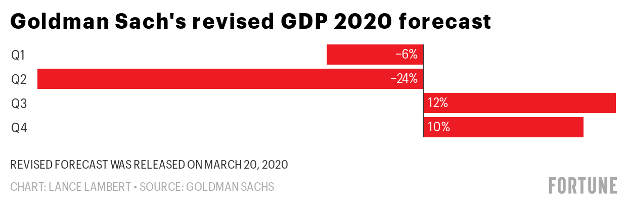 The U.S. grew at 2.1%. in the final quarter of 2019. That modest growth could soon be upended by sharp decreases, according to Goldman Sach’s GDP forecast released March 20. And given the 10 million Americans who’ve claimed unemployment in the weeks since, that forecast might be too conservative.