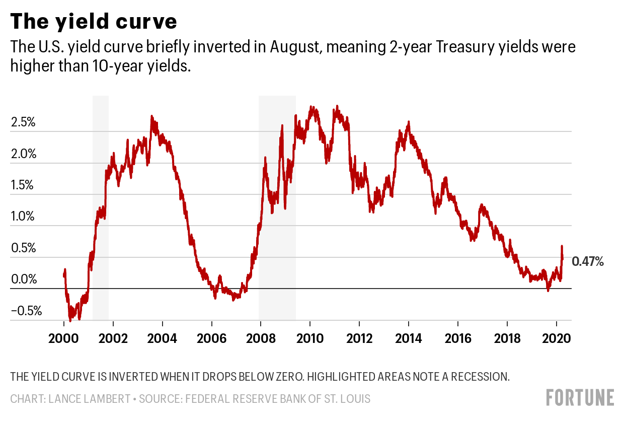 Back in August 2019 the yield curve inverted, which means long-term rates were temporarily lower than short-term rates. Historically, this usually happens before a recession. Since then, the inversion has receded. But the fact it inverted means there was already some concern in the economy even before COVID-19.