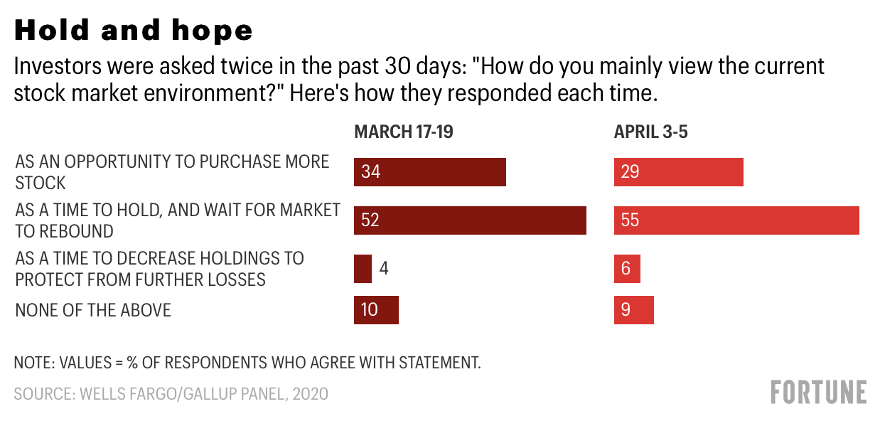 The data is part of a Gallup/Wells Fargo survey which found that the majority of investors (55% as of April 3-5) view the current market as a time to sit on the sidelines until prices recover and a calmer pattern emerges. That bearish view among investors has increased since the tumultuous trading days in mid-March just before the S&P 500 hit its 2020 low.