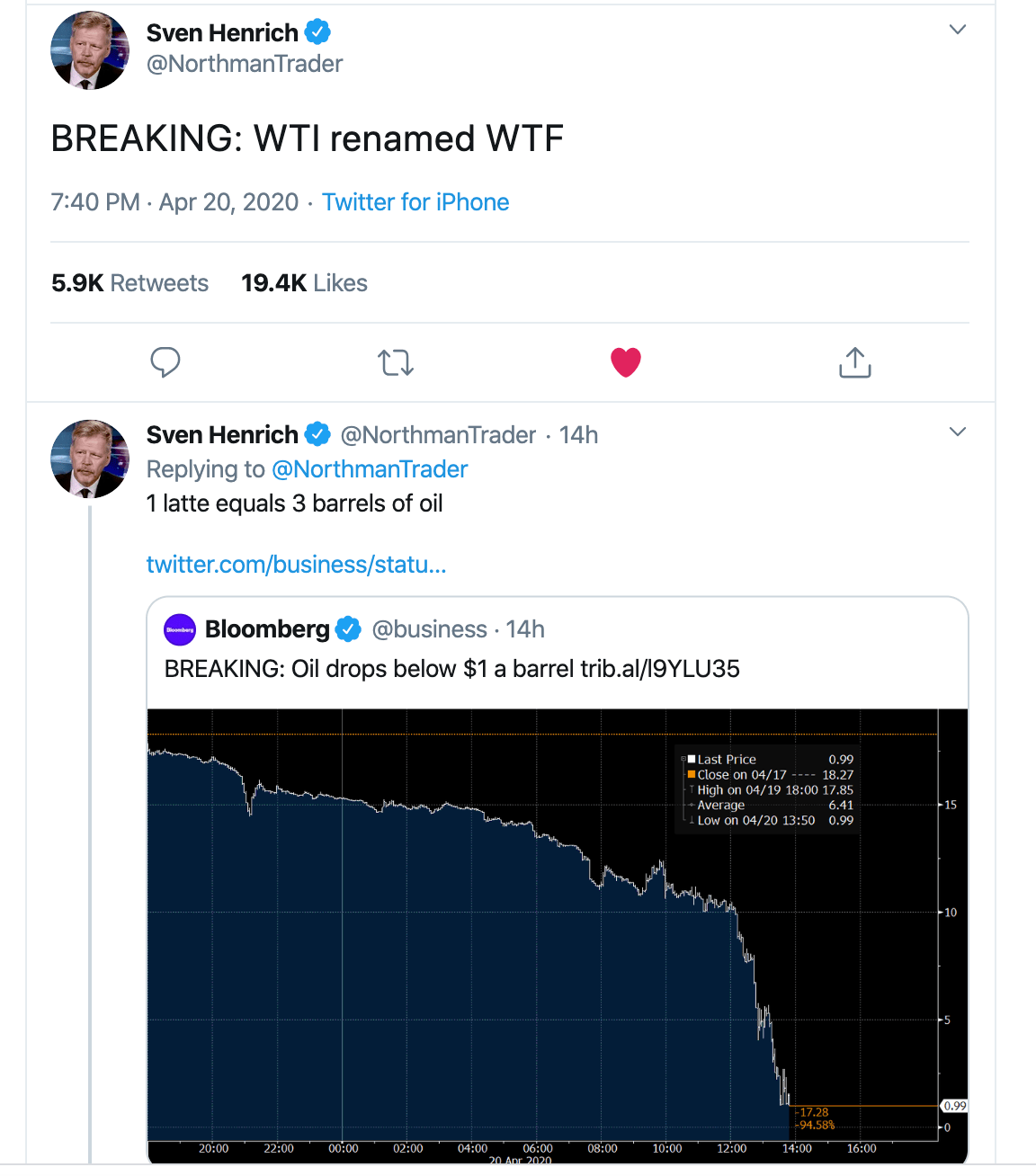 - Crude is a good news/bad news story. WTI was up more than 100% in morning trade, but it was still hovering around zero. Brent crude, the global benchmark, is down more than 7%, but at least it’s trading in the twenties.