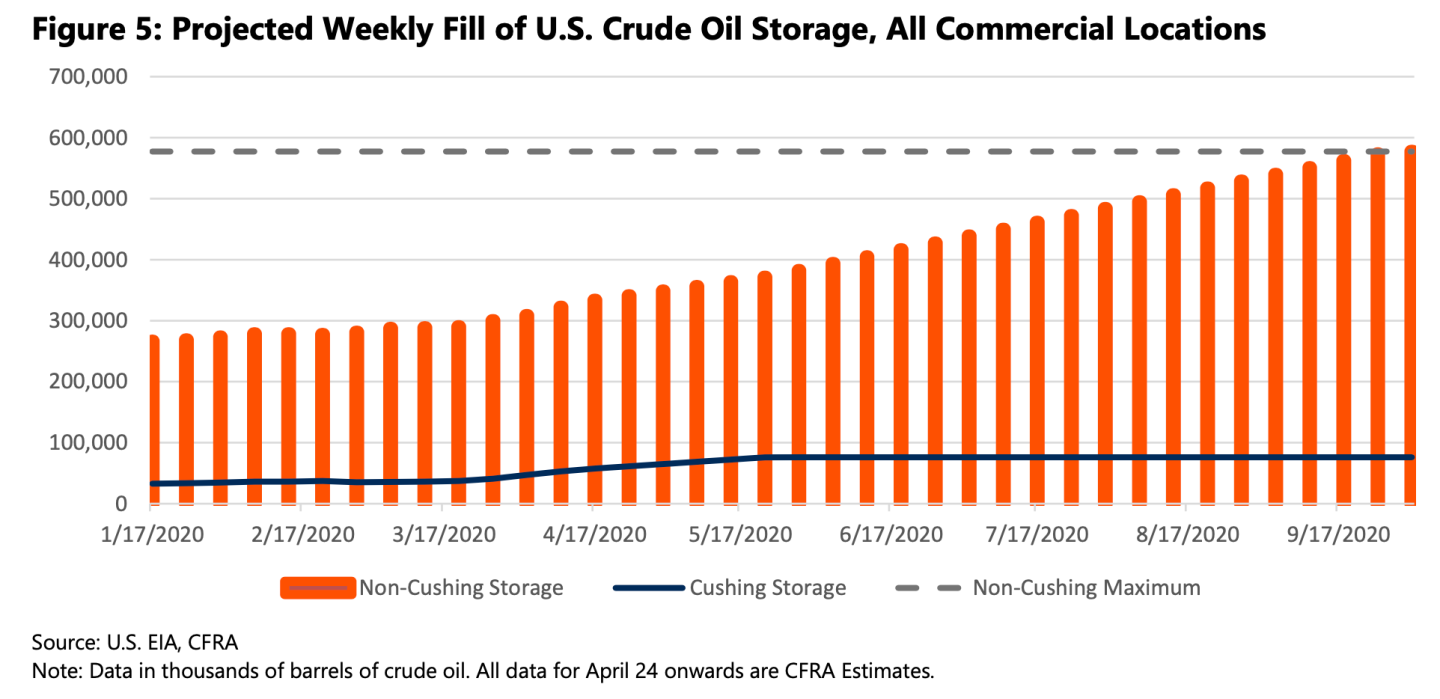 This chart and data comes courtesy of CFRA, an independent investor research firm, that sent me their oil report yesterday. They project that Cushing will run out of storage space by the end of May, a development that could spook the markets further as it has the capacity to hold a whopping 76 million barrels. Once Cushing is no longer available, we’re looking at no more than three to four more months before commercial U.S. storage (should current output and demand rates persist) reaches its limits. Yes, the U.S. government could step in and buy crude to fill the strategic petroleum reserve, but that too is close to the brim—already 89% full, CFRA says.