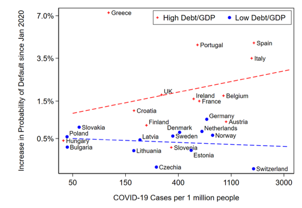 The graph below shows this general relationship in a large sample of European countries. Higher COVID-19 infection rates are associated with significant increases in implied probability of default only among the countries with relatively high debt-to-GDP levels. Investors’ assessment is rational to the extent that countries with better finances can support their businesses for longer following a decrease in economic activity.