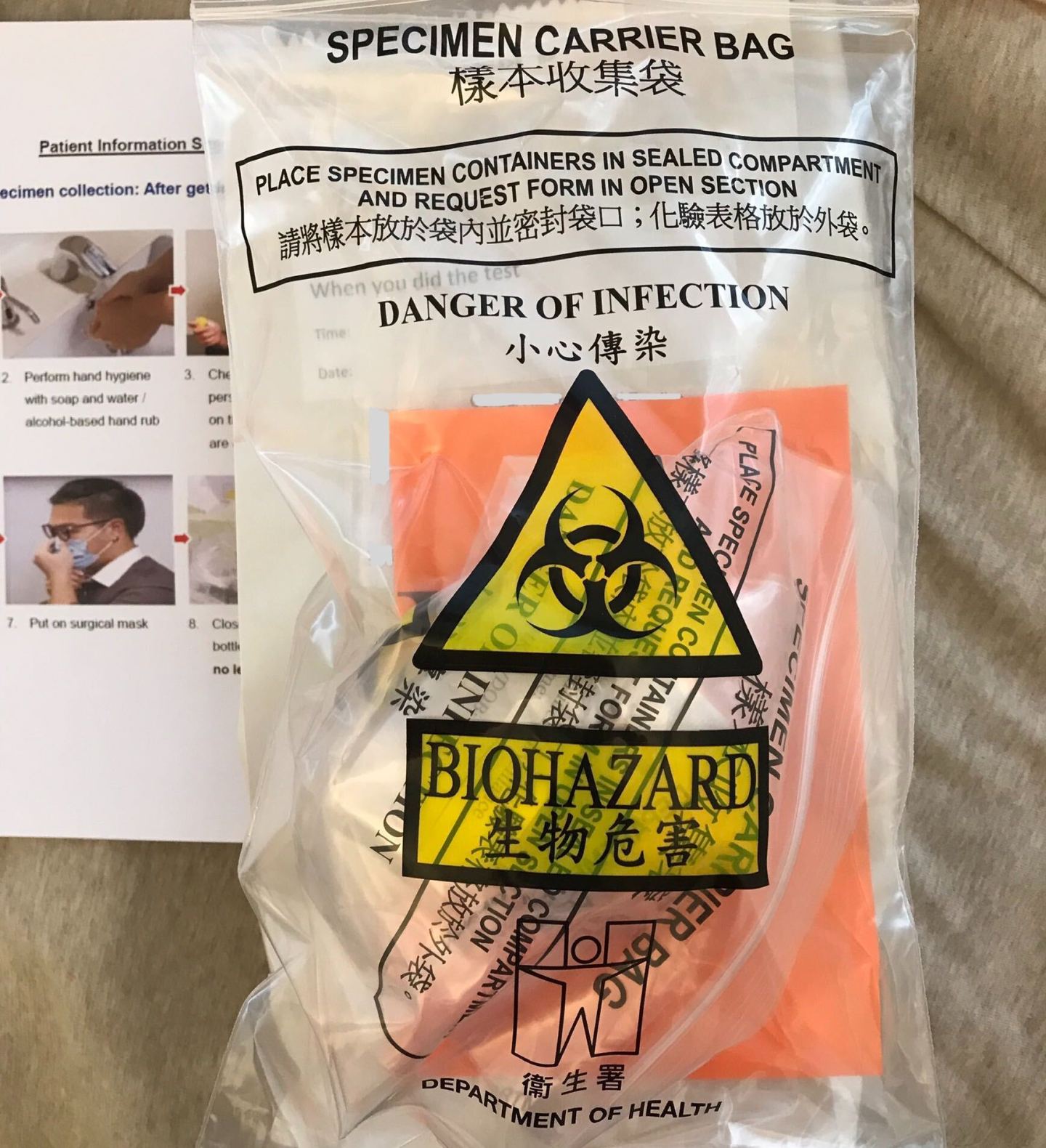 I went home with a doggie bag of tools: written instructions, the specimen collection bottle—a small plastic screw-cap cup—and two sealable plastic specimen carrier bags, labeled ‘DANGER OF INFECTION’ in capital letters and the spiky trefoil biohazard symbol in yellow and black, with ‘BIOHAZARD’ emblazoned underneath for good measure. (Subtlety is not a virtue in a global pandemic.)