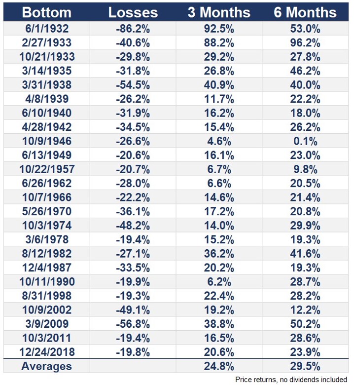 Here are the 3 and 6-month returns from the bottom of past S&P 500 bear markets: