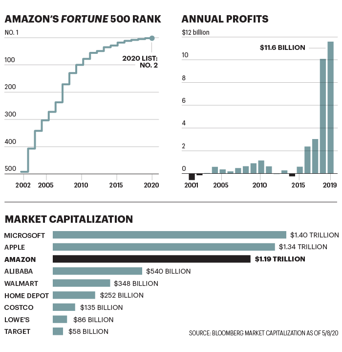 As always, Bezos is playing the long game. And it’s a strategy that has produced spectacular results. This year Amazon jumped three spots on the Fortune 500 list to No. 2—its highest ranking ever. Since the company first made the list in 2002 at No. 492, its market value has risen more than 22,000%—it was hovering at around $1.2 trillion in early May—and the company’s sales have grown an average of 28% annually. Studying the formula behind that stunning growth trajectory is key to understanding just how much more powerful Amazon may become over time.