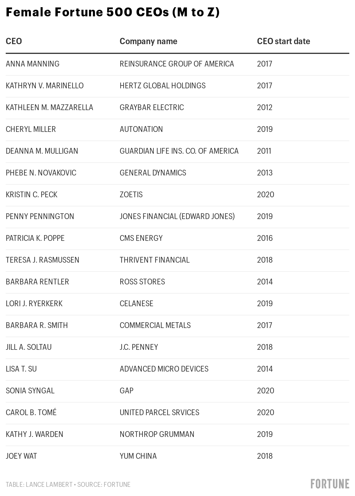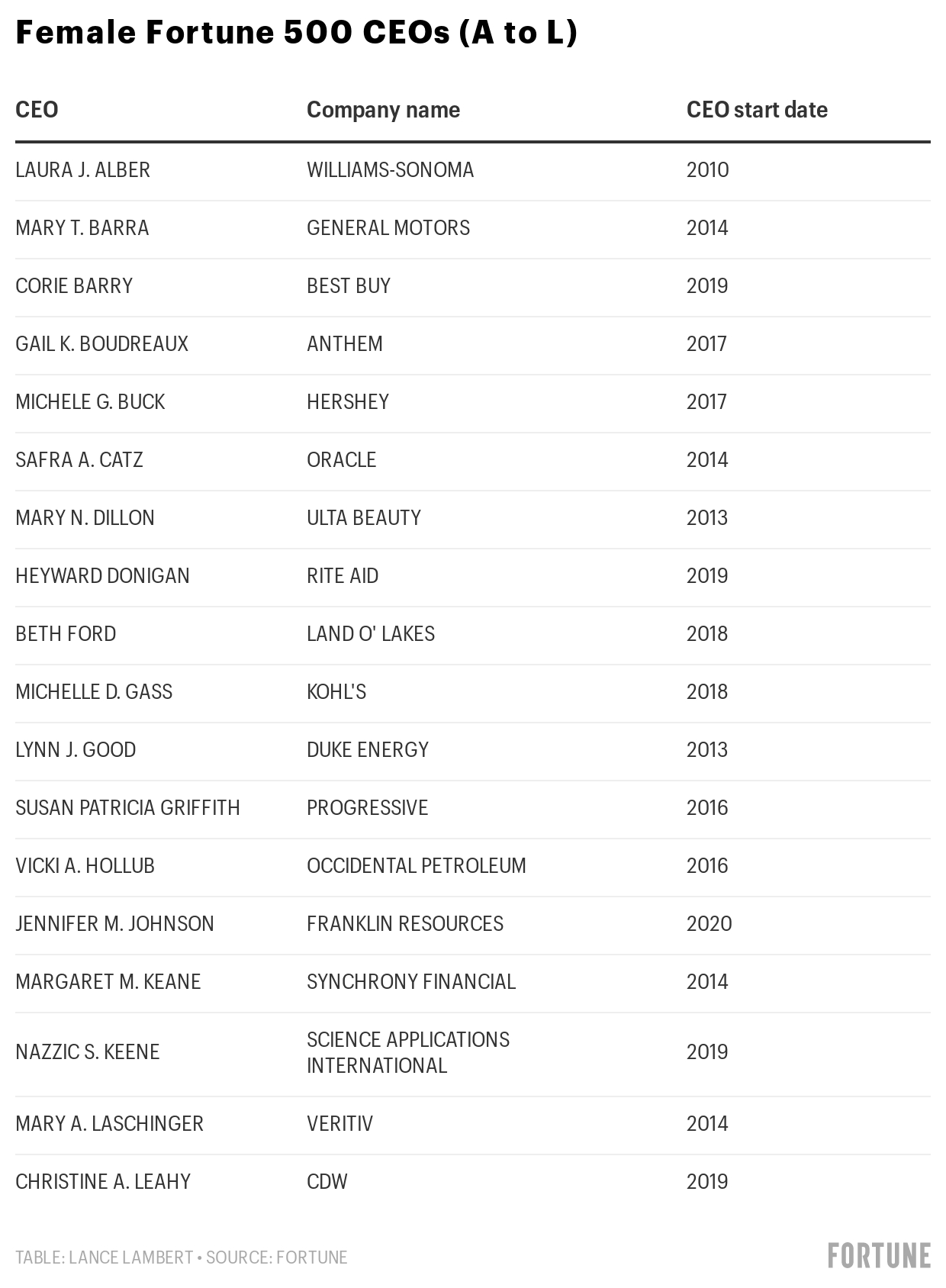 Other changes of note in the past year include Safra Catz’s leadership at Oracle; she is now the sole CEO of the company after the death of her co-CEO Mark Hurd. At AutoNation, the country’s largest dealership chain, CEO Cheryl Miller is on a health-related leave of absence but is still included in this tally. And Judy Marks is the CEO of $13 billion Otis Elevator, but a technicality prevents her from being included in this group. Otis spun off from Raytheon Technologies in April, a development not considered for this year’s Fortune 500, which is based on the 2019 fiscal year; if Marks is still in charge of the new standalone company when it is expected to make the Fortune 500 this time next year, she will be added to the list.