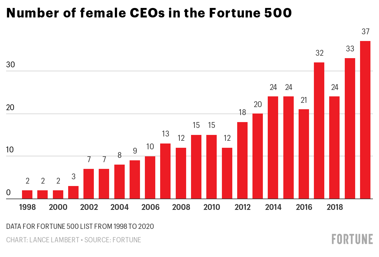 This year’s tally soundly beats last year’s 33, which was itself a new record. Yet the big picture is less encouraging: even with a record 37 female CEOs, women run just 7.4% of the 500 businesses on the ranking. (For perspective: Twenty years ago, women ran two.) Only in the past four years has the growth of women in these roles accelerated past 30—a general upwards trend, though there have been dips along the way.