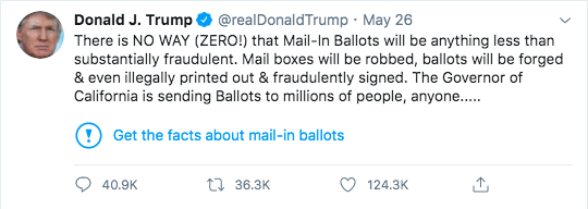 On Tuesday, Donald Trump claimed via his favorite microblogging microphone that mail-in ballots for voting “will be…substantially fraudulent.” Underneath the tweets, Twitter placed an exclamation mark and a link to more information: “Get the facts about mail-in ballots,” the note read, redirecting people to coverage debunking the unsubstantiated claims.