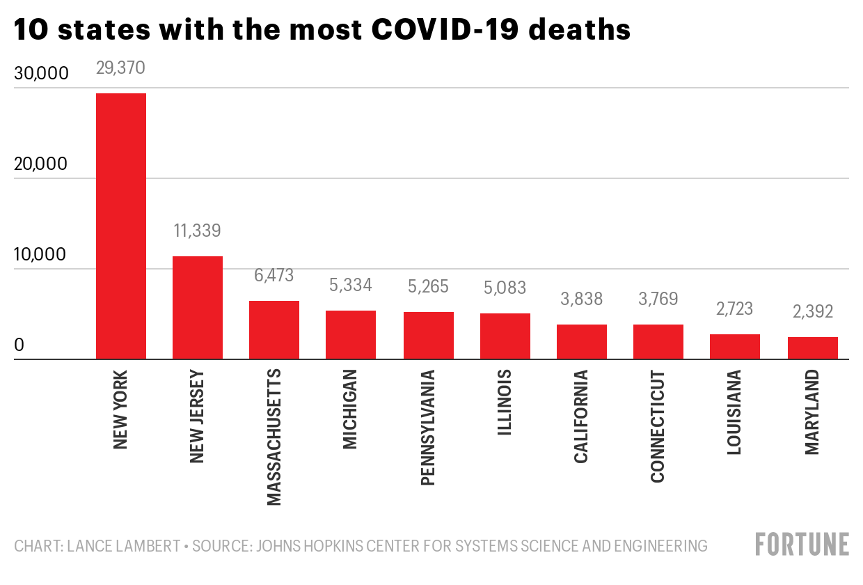 New York leads the nation with 29,370 COVID-19 deaths, followed by New Jersey with 11,339 deaths, and Massachusetts at 6,473 deaths. So far, the pandemic has taken the most life in the Northeast. Meanwhile, the second and third largest states by population, Texas and Florida, don’t rank in the top 10 for COVID-19 deaths.