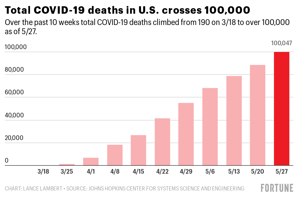 The number of COVID-19 deaths in the U.S. climbed to 100,047 on Wednesday, according to data collected by Johns Hopkins University. The United States represents 28.3% of reported global COVID-19 deaths.