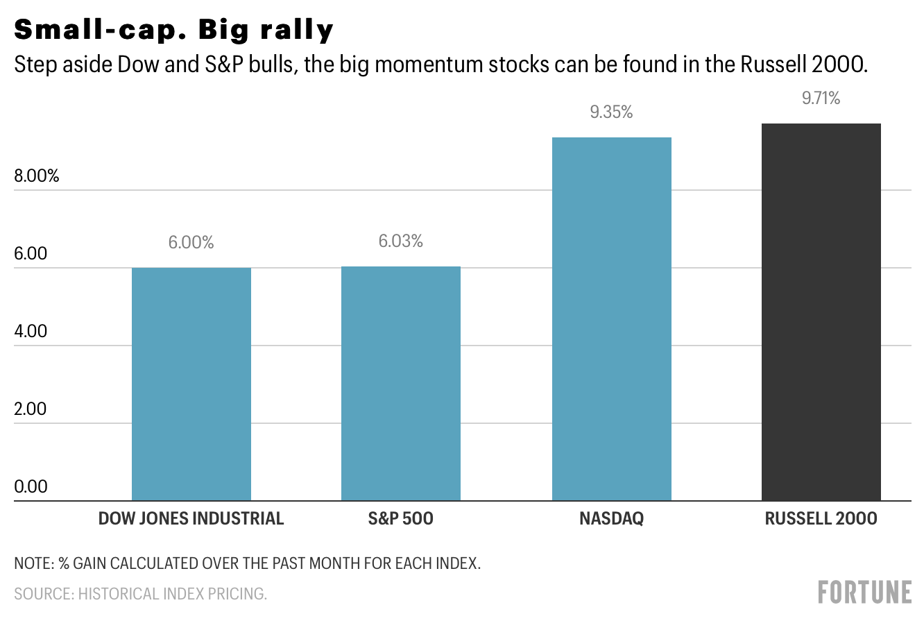 As Fortune reported last month, the Russell often acts as an important bellwether for the broader U.S. markets. That’s often true on the way down, amid market slumps, and on the way up, as we’re now seeing. Today’s chart shows the Russell vs. its peers over the past month. The Russell 2000 is even outperforming the Nasdaq.