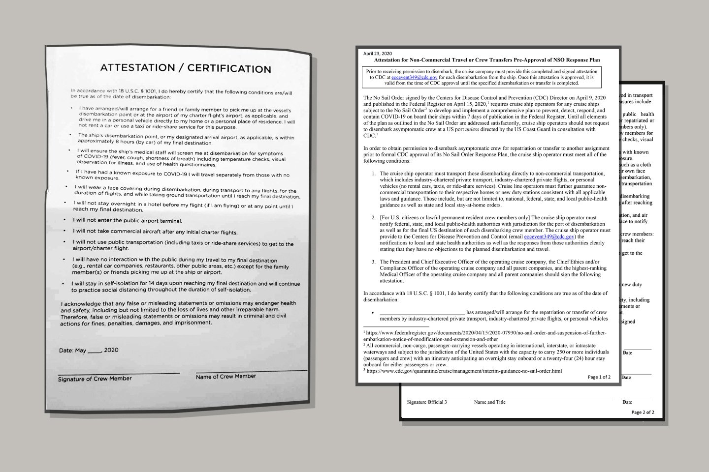 On the Internet, everybody is going back and forth—it’s the cruise line’s fault; they don’t want to spend money; or it’s the CDC’s fault. I’m not trying to stick up for my company, but when you look at the rules from the CDC of what they needed to do to get us ashore, it was absolutely impossible. There were all these rules. They basically wanted private charter jets for every single person. We couldn’t use the bathrooms or walk into any place, from point A to point B. If the state of Iowa had sent me a private jet themselves, I still couldn’t have gotten ashore because they would have needed to work with the ship and with the CDC with a 72-hour notice. But we couldn’t give a 72-hour notice because we never knew when we were going to be in a port. [Editor’s note: All of the CDC’s requirements are spelled out here. An agency spokesperson said while the CDC requests 72 hours’ notice, the organization has approved many requests to disembark crew with a same-day turnaround.]