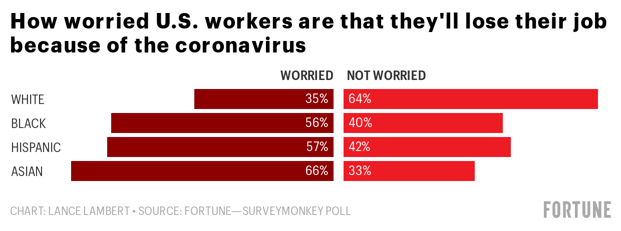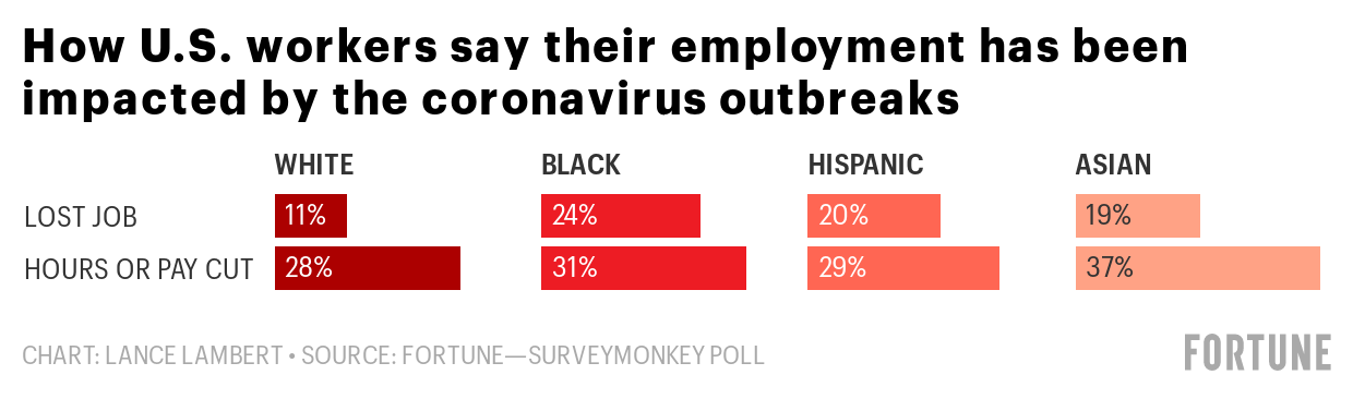 And it’s not just unequal job losses—pay cuts have also been unequally doled out. The Fortune-SurveyMonkey poll finds that while 28% of white workers got their hours or pay cut, that rose to 29% of Hispanic workers, 31% of black workers, and 37% of Asian workers.