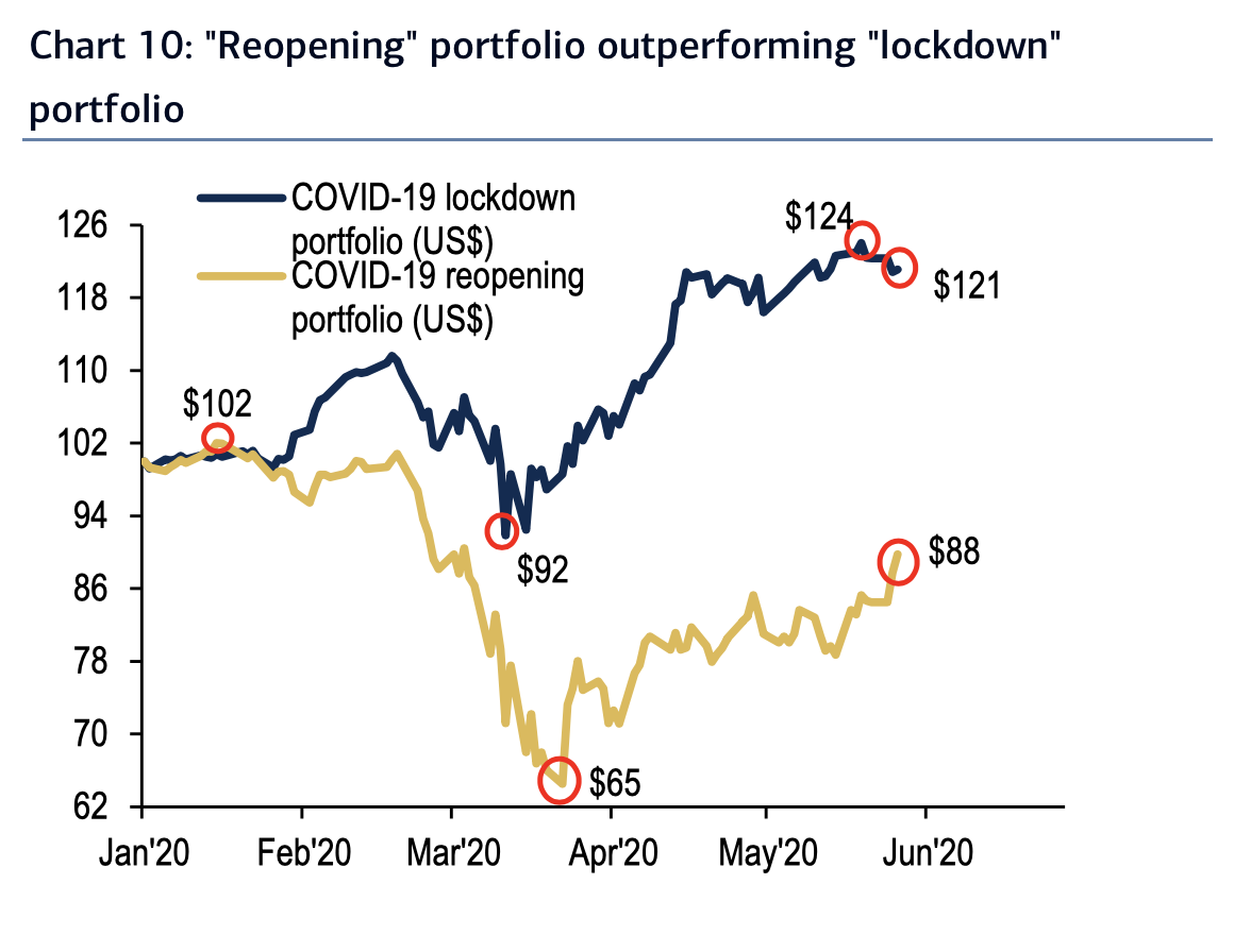 During this current rally, the “lockdown” assets are still holding their own, but the “reopening” assets are beginning to close the gap, as this second BofA chart below shows. (The BofA chart was published at the end of last week; the gap has narrowed further over the past three trading sessions.)
