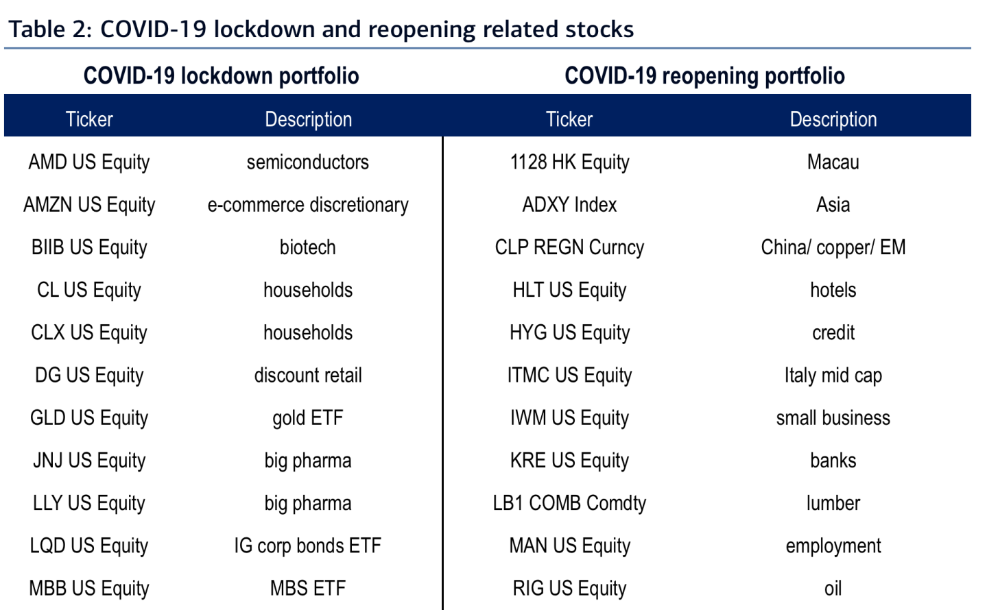 And what’s driving the upward leg of the “V”? Things like oil, copper, banks and Italian mid-cap stocks—what BofA Securities calls its “reopening portfolio.” These beaten-down assets are way off their lows, and driving much of the rally in recent weeks. They should be the first to rebound when lockdown measures ease, and people start to resume something resembling a normal life. You can see some of the “reopening” assets in BofA’s table below (right-hand column).