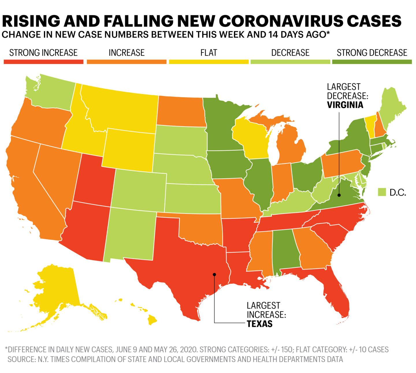 In nine states, the total number of new cases of COVID-19 reported on June 9 was at least 150 more than two weeks prior according to a Fortune analysis of New York Times data. Texas—one of the first states to lift pandemic restrictions—had the largest increase in new cases, reporting 1,945 on June 9 compared to 1,053 new cases on May 26. North Carolina, which reported just 191 new cases on May 26, posted 812 new cases yesterday. Aside from Utah (where gubernatorial candidate John Huntsman, Jr. is among the newly infected), the states with the most worrying figures are in the South. Some leaders have cited increased testing as a factor in the increased case numbers.