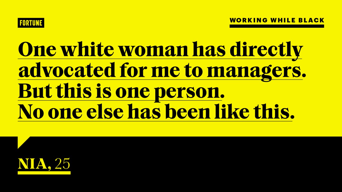 Nia, 25, told Fortune: “One white woman has directly advocated for me to managers. She has facilitated wider conversations about race because she knows people will listen to her. She takes the stage and gives it to me and the two other black people in our office. She has given me advice. She has bought me coffee on rough days recently. She realizes she can’t solve everything, but she tries and does what she can and is open to critique on herself. But this is one person. No one else has been like this.”