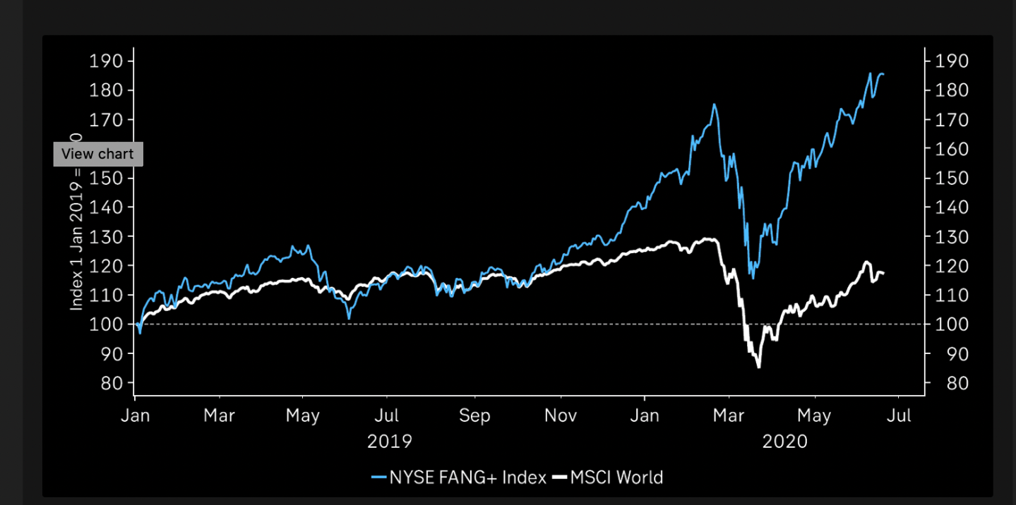 The all-equity MSCI World (in white) is seeing something like a square-root symbol—or, take your pick, a radical sign. Meanwhile, the FANG+ index (in blue) is seeing a proper “V.” With a capital V, that is.