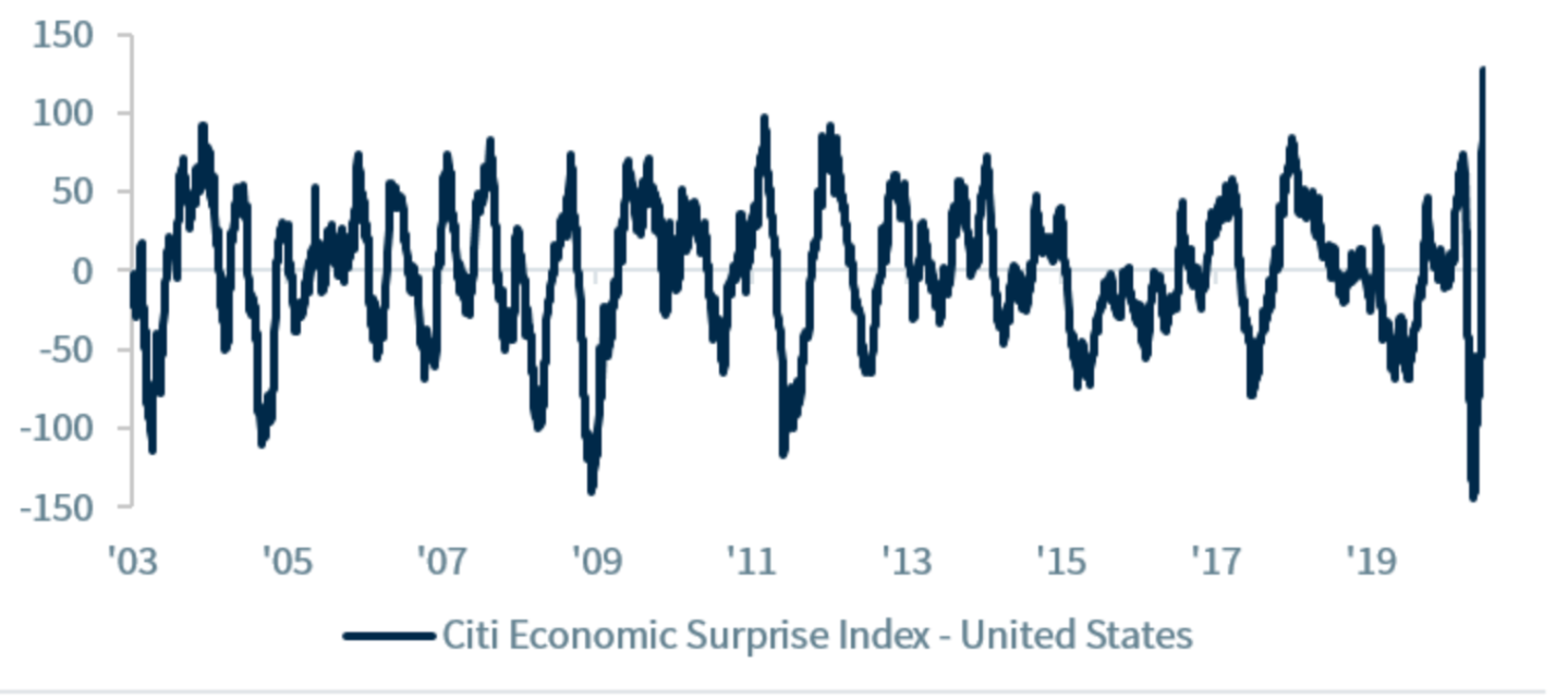 In a pandemic, it’s probably wise not to put too much weight into any one forecast. Something like the Citi Economic Surprise index would be a better indicator. What’s the surprise index? It’s a measure of how much the official economic data comes in above or below the aggregate of economists’ forecasts. Here’s what you need to know about the index: a positive reading means the data is surprising to the upside—that is, the actual numbers are better than all those forecasted numbers.