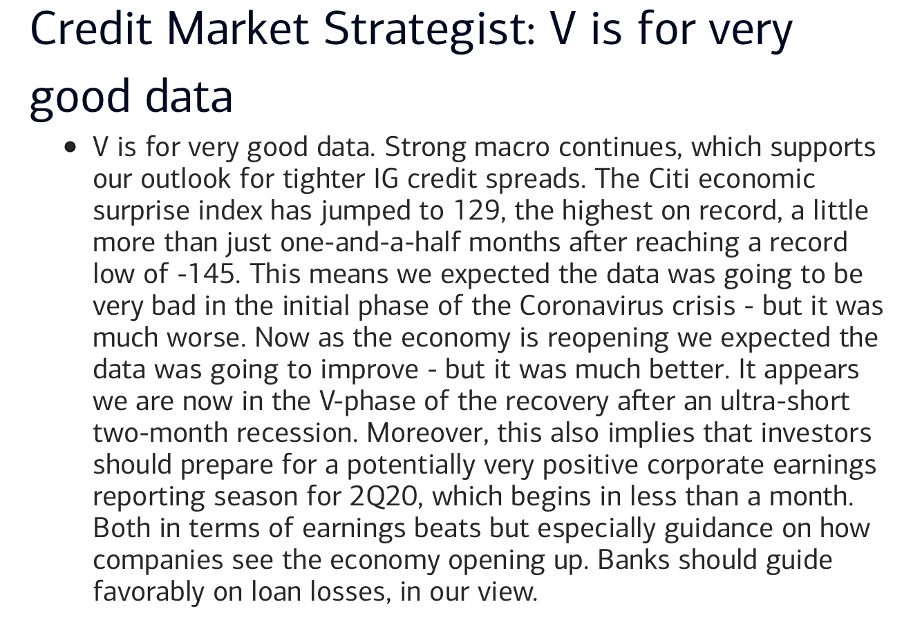 The surprise index has—surprise!—not only turned positive, but it’s at a record high. In fact, we’ve gone from a record-low (the economic warning signs were worse than expected) at the end of April, to a record-high this week. That’s leading analysts at BofA, for one, to conclude the U.S. is on the upward “V” of what will be an “ultra-short” recession, and that corporate earnings will pick up dramatically in the short term. That’s closer to Mnuchin’s optimistic call yesterday than the Fed’s gloomy call last week.