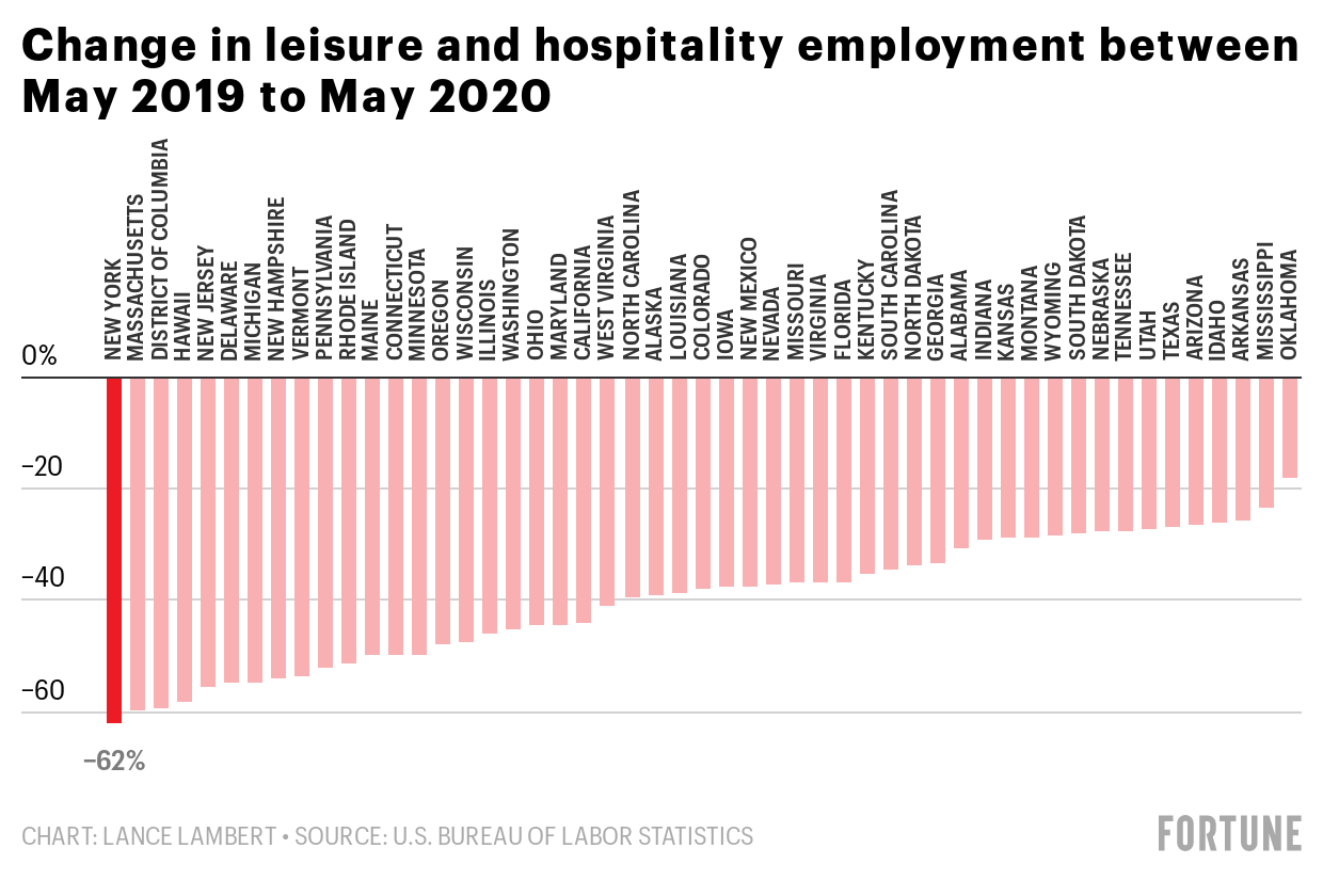 The number of U.S. leisure and hospitality jobs is down 41% year over year in May, from 16.5 million in May 2019 to 9.8 million now. It is hands down America’s hardest-hit industry during the pandemic. But that economic blow is far from even when you delve into state-level data.