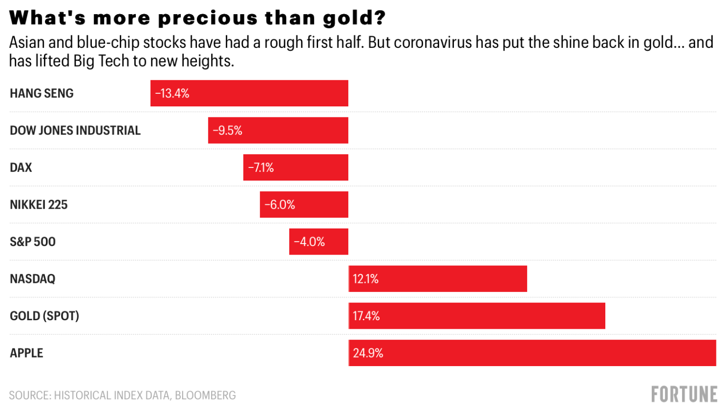 The big winners are tech (look at Apple, up nearly 25% YTD) and gold (17.4%).