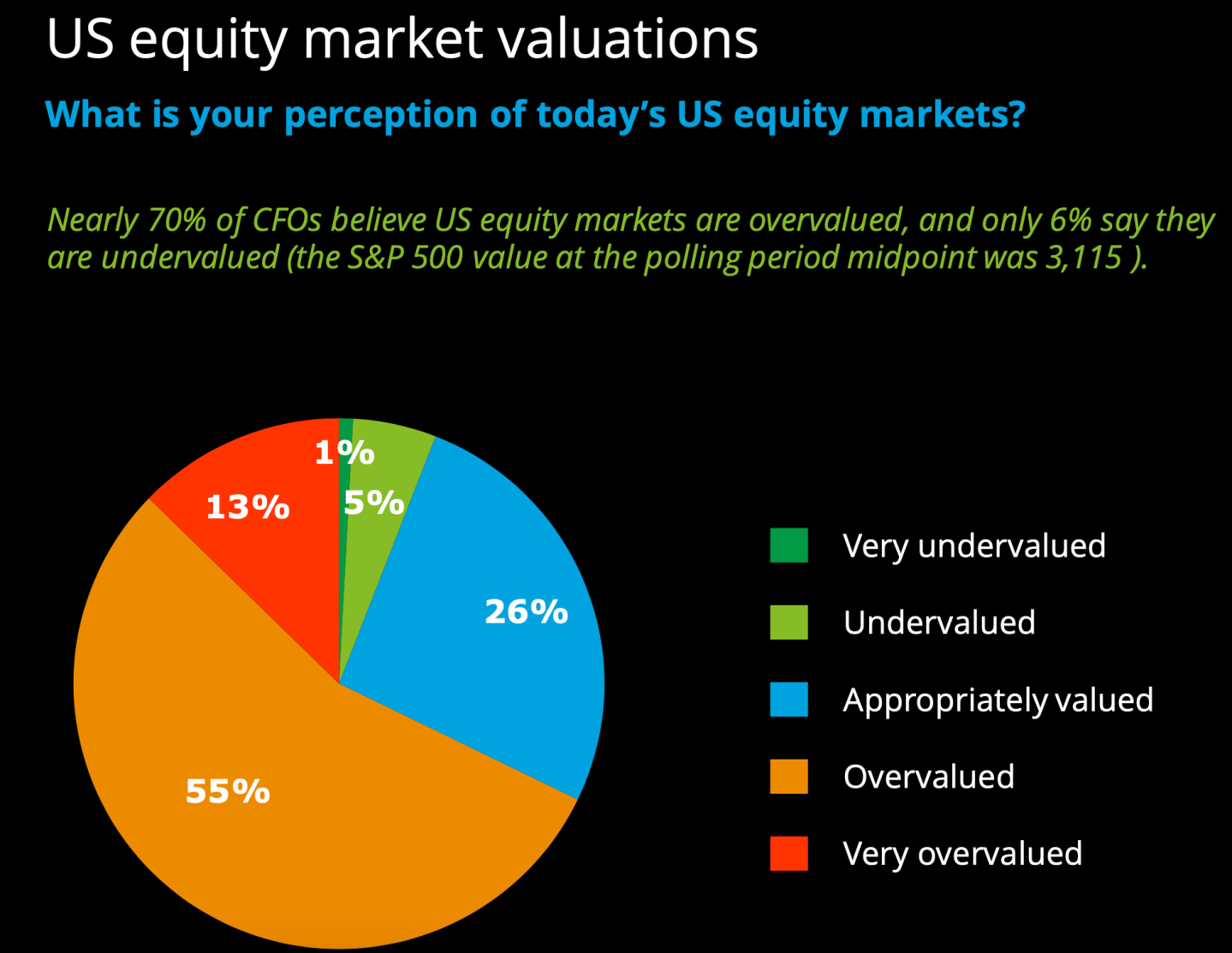 Nearly seven out of ten CFOs say equity markets are either “overvalued” or “very overvalued.”