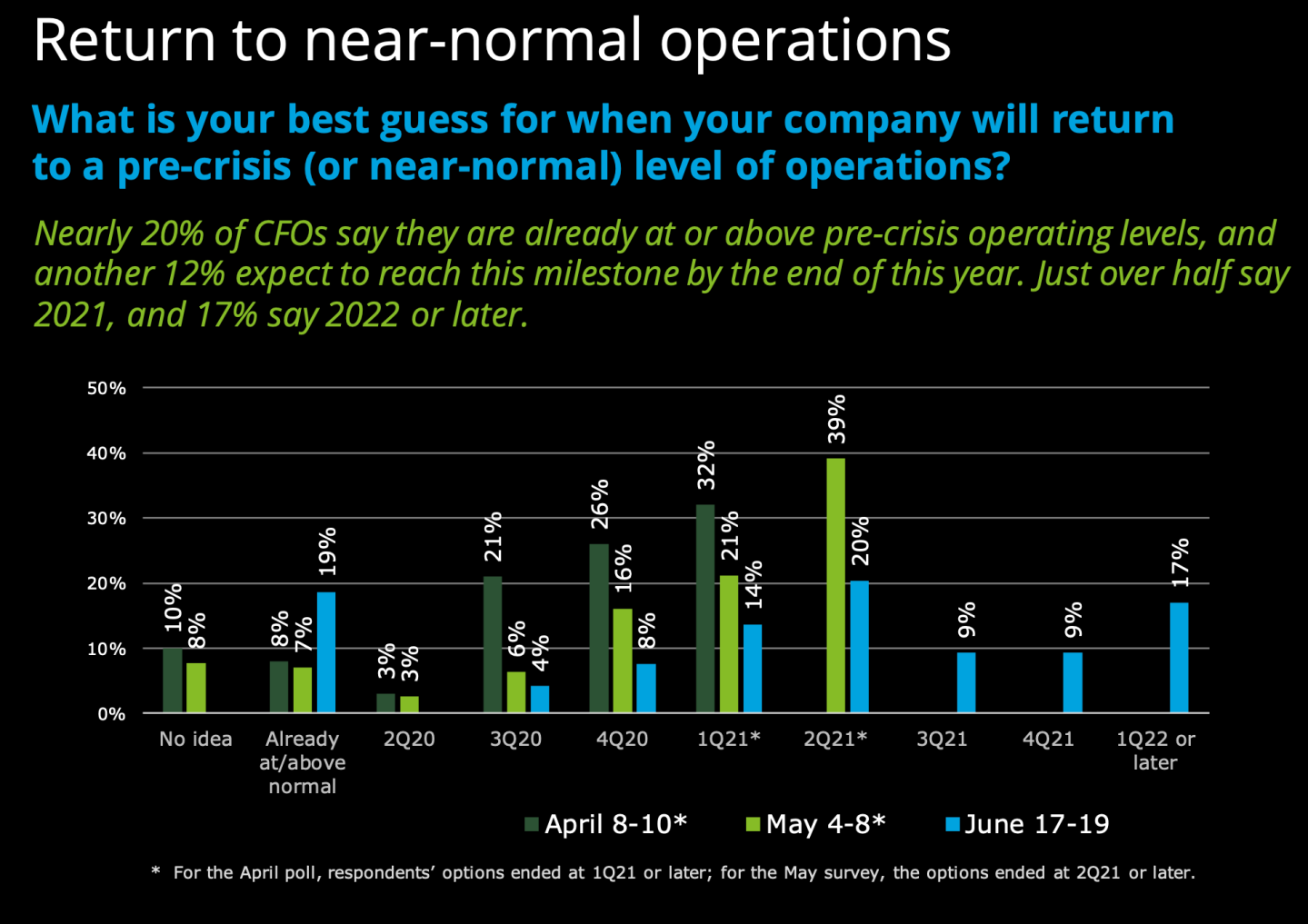 The less encouraging news is that this is an extremely uneven recovery. In sectors such as retail, financial services and manufacturing, the majority of CFOs don’t expect to be at or near pre-crisis levels before next year. And, 17% of all CFOs polled said they won’t reach that level before Q1 2022.
