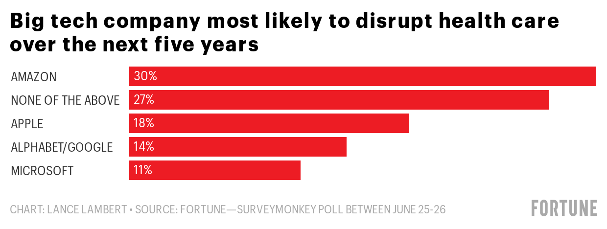 But it’s Amazon that the public sees as the most likely to disrupt the health care industry, with 30% of respondents picking the Seattle-based firm. The least likely? Just 11% of U.S. adults say Microsoft is likely to be the top health care disrupter.
