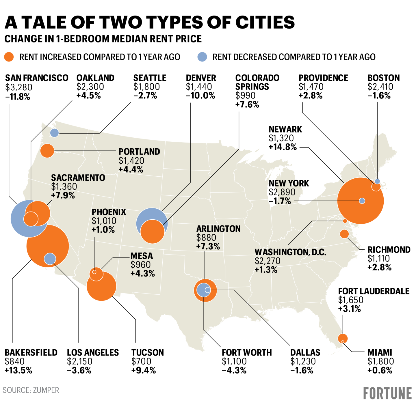 And while the number of Americans fleeing cities appears to be more of a trickle than a flood, there is an exception: San Francisco. According to Zumper’s data, the average rent in the city has plunged by 11% this year, a figure that Georgiades describes as “staggering.” He says that the narrative of a flight from the pandemic is more true in the Bay Area than anywhere else in the country. The reason, he claims, is that tech companies are more inclined to embrace remote work both in the short term and long term—leading many workers, including some of the more than 40,000 employees at Facebook—to leave the Bay Area altogether.
