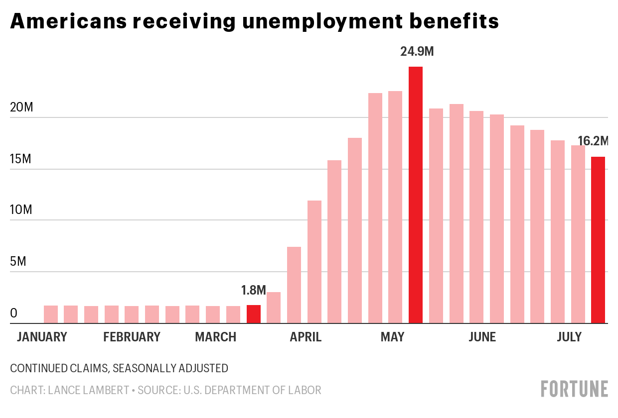 But this uptick pales in comparison to what the economy experienced in March when it went from 282,000 weekly claims to 6.9 million in just a two week period. And there is reason for optimism: The total number of Americans receiving unemployment benefits fell from 17.3 million to 16.2 million. However, that figure runs one week behind new claims data, and very likely could go up again next week.