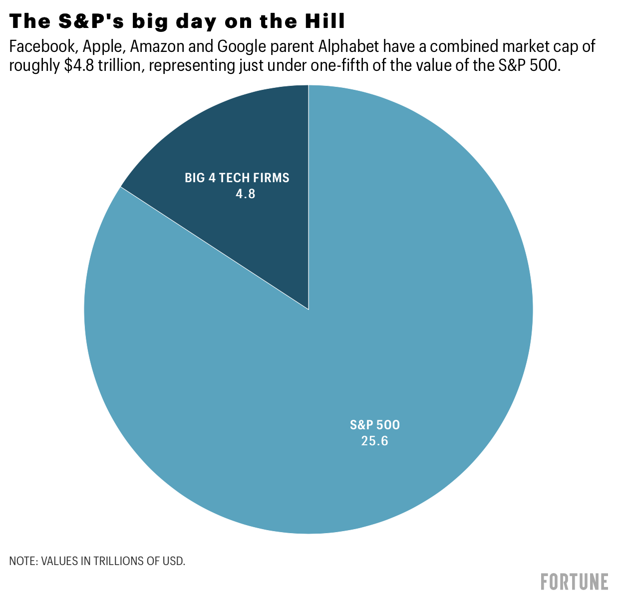 Google parent Alphabet, Amazon, Apple, and Facebook have a combined market cap of $4.8 trillion, a significant (and growing) piece of the S&P. (Add Microsoft, which is not testifying today, and that pie wedge swells to $6.3 trillion, or nearly one-quarter of the benchmark index.)
